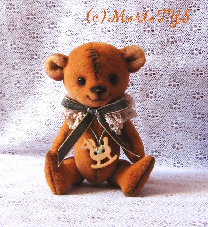 сшит из миништоффа,вставочки на ушках-винтажный плюш,шплинтовые крепления,наполнитель -синтепух и гранулят,глазки пластиковые,нос вышит нитками мулине,воротничок связан крючком, из ниток (100%хлопок),ленточка французская,кулончик-деревянная лошадка.