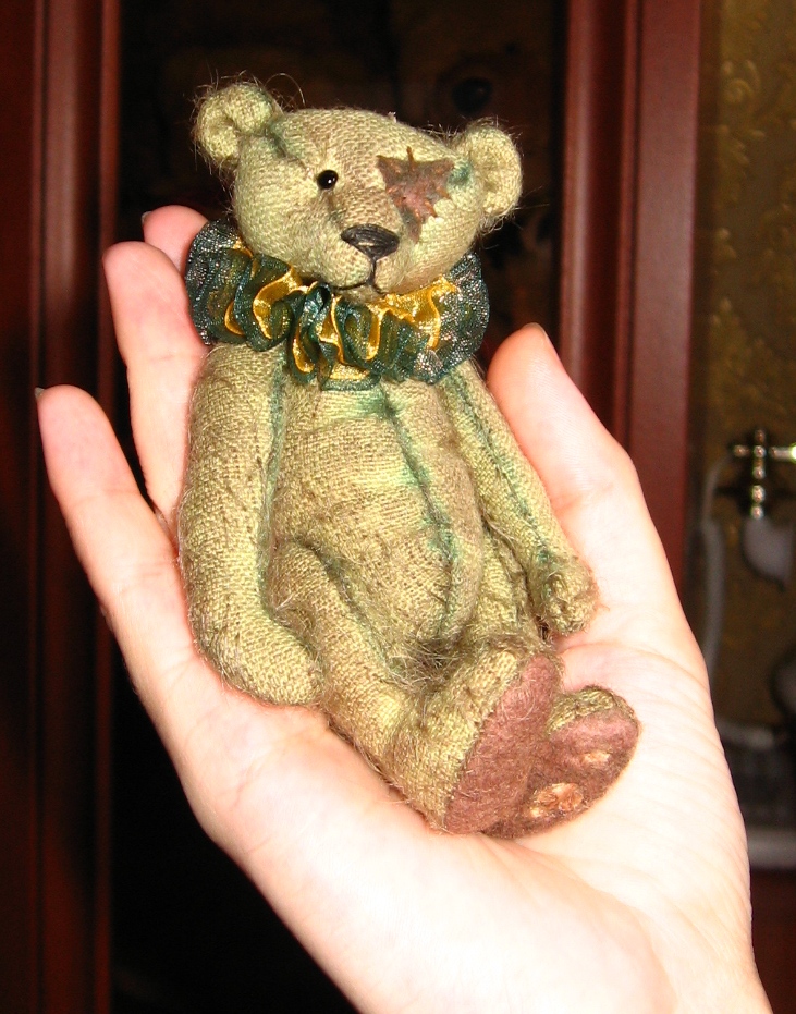 сшит из немецкого мини-мохера,наполнитель синтепух и минеральный гранулят,шплинтовые крепления.глазки пластиковые на петельках,вставочки на лапках и ушках-миништофф,воротничок связан крючком из 100% хлопка.тонирован пастелью.