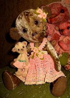 сшита из немецкого мохера,вставочки на лапках и ушках-миништофф,глазки пластиковые на петельках,наполнитель-синтепух и минеральный гранулят,шплинтовые крепления,платьице связано из 100%хлопка,ленточка-французский хлопок,тонирована пастелью.