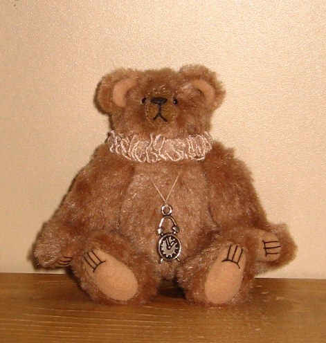 Сшит из шелкового мохера(Германия),вставочки на ушках и лапках-иск.замша,глазки-оникс,наполнитель-синтепух и гранулят,шплинтовые крепления ,нос и лапки вышиты нитками мулине,металлическая подвеска-часики,воротничек-кружево.
