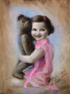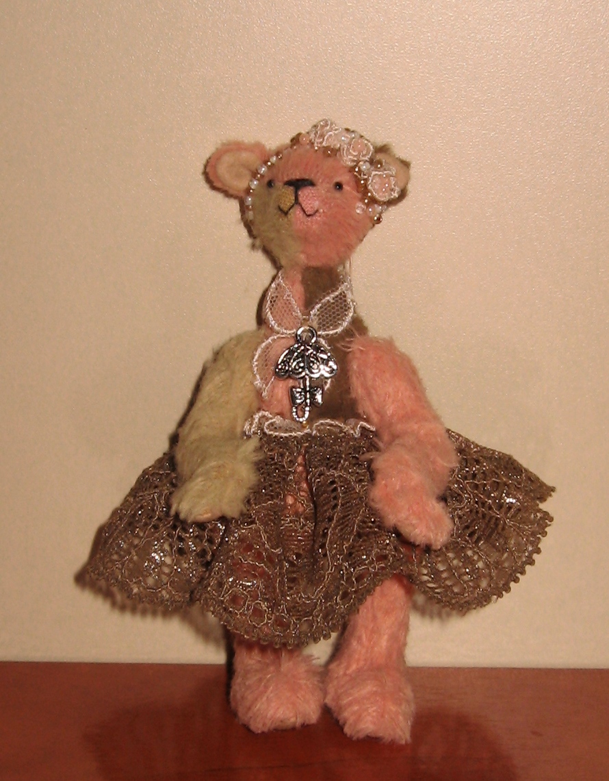 Сшита из вискозы,вставочки на лапках и ушках-иск.замша,наполнитель -синтепух и гранулят,шплинтовые крепления,глазки-оникс,юбочка-кружево двух видов,бисер,носик вышит нитками мулине,тонирована пастелью.