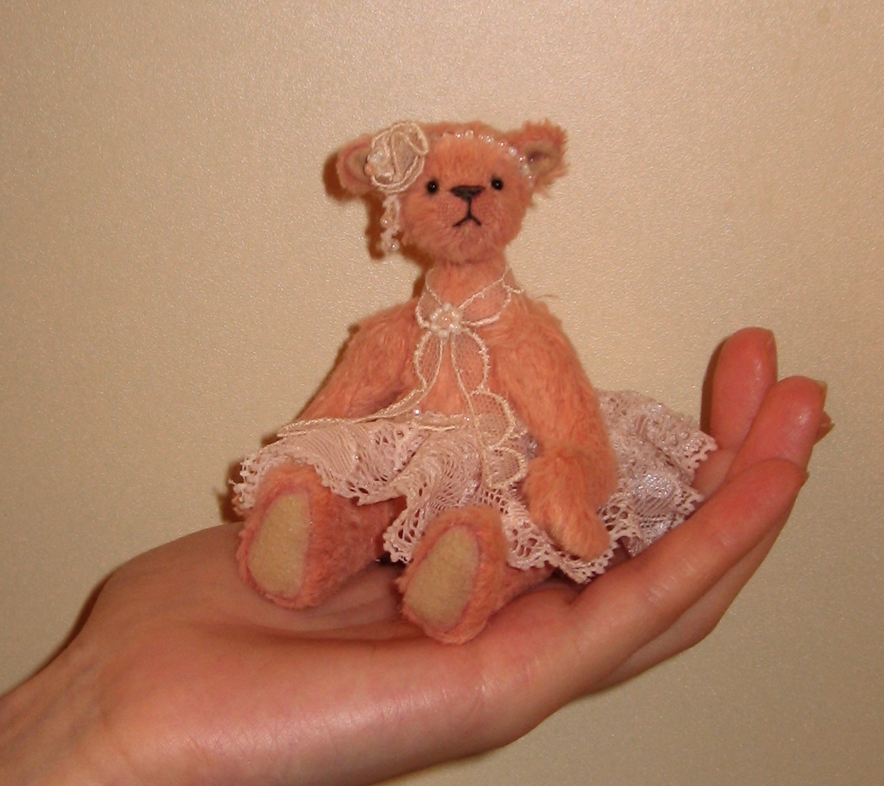 Малышка Эмми,10см।,авторская выкройка। сшита из вискозы,вставочки на лапках и ушках-иск।замша,наполниетль-синтепух и гранулят,шплинтовые крепления,глазки-оникс,платьице-кружево,розочка-ручная работа из холодного фарфора,тонирована пастелью.