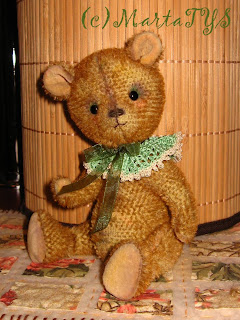 сшит из немецкого мини-мохера,наполнитель синтепух и минеральный гранулят,шплинтовые крепления.глазки пластиковые на петельках,вставочки на лапках и ушках-миништофф,воротничок связан крючком из 100% хлопка.тонирован пастелью.